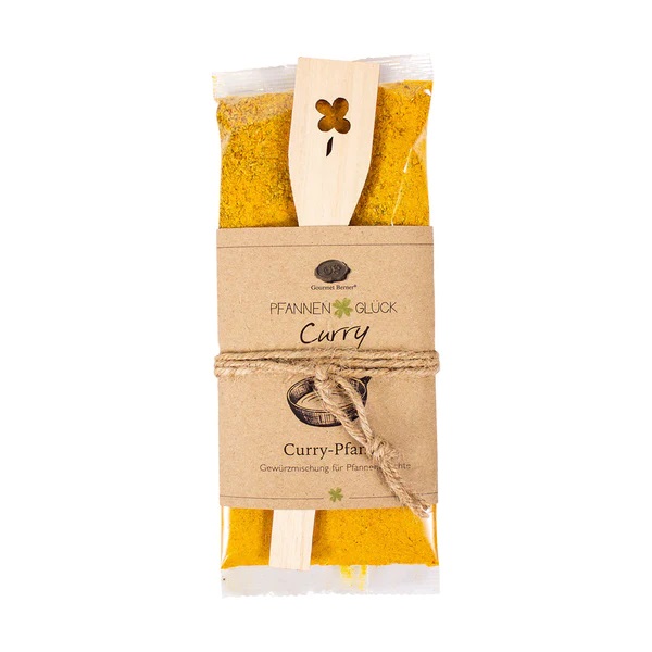 Curry-Pfanne Gewürzmischung für Pfannengerichte Inhalt: 85g Beutel, mit Kleeblatt Pfannenwender. Zutaten Koriander, Kurkuma, Bockshornklee, Meersalz, Fenchel, Kreuzkümmel, Pfeffer, Chili, Gewürznelken, Knoblauch. Zubereitung siehe Rückseite der Verpackung.