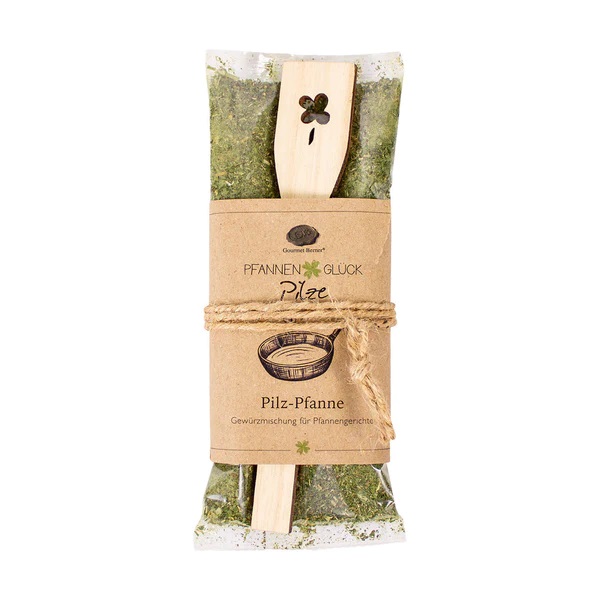 Pilz-Pfanne Gewürzmischung für Pfannengerichte Inhalt: 60g Beutel, mit Kleeblatt Pfannenwender. Zutaten Meersalz, Schnittlauch, Petersilie, Zwiebeln, Pfeffer, Dillspitzen, Knoblauch, Zitronenschalen, Thymian, Rosmarin. Zubereitung siehe Rückseite der Verpackung.
