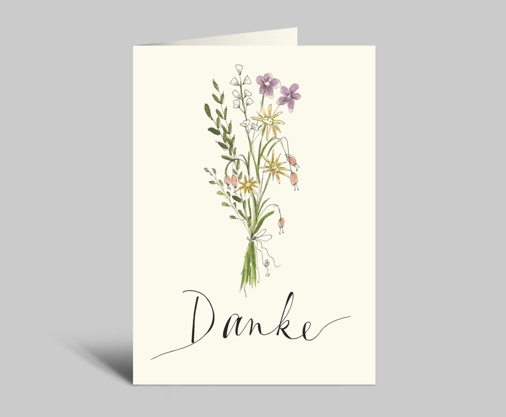 Der bunte Blumestrauß ist stilvoll mit Aquarellfarben gemalt worden und wird durch ein mit schwarzem Pigmentliner geschriebenen "Danke" ergänzt.