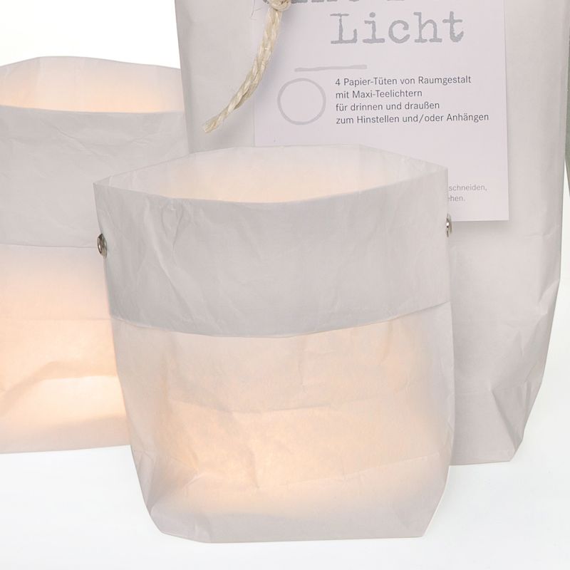 Vier kleine Papiertüten mit Ösen, vier Maxi-Teelichter und ein bisschen Draht – alles zusammen verpackt in einer großen Papiertüte, schön als Geschenk, das ideale Licht für drinnen und draußen, zum Stellen oder Hängen.