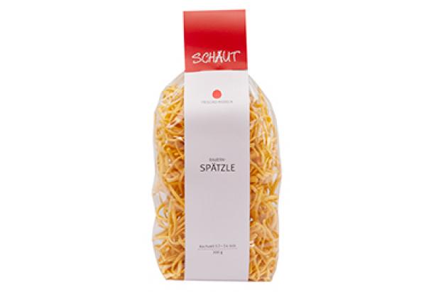 Diese Frischei-Bauernspätzle sind noch echte Handarbeit. Sie werden in der Familienmanufaktur Schaut aus naturbelassenen und ausgewählten Zutaten gefertigt. Sie werden sehen, man schmeckt den Unterschied.