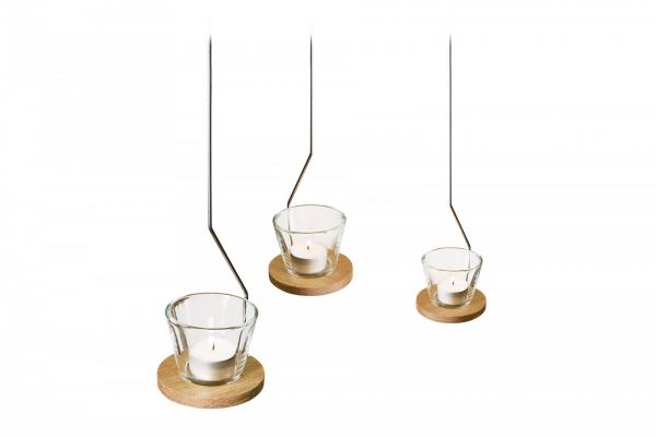Der reduzierte Eichenteller bietet in Kombination mit dem Draht die Möglichkeit, das Licht schweben zu lassen. Das klare Glas hält dabei sicher in der Aussparung des Eichentellers.