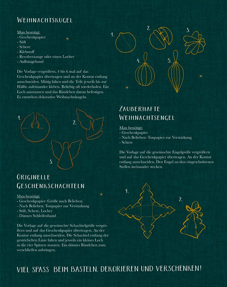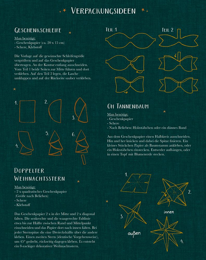 Beigaben: 10 Geschenkpapierbogen in Broschur mit 2 Seiten DIY-Ideen und Geschenkanhängern / Einband mit Goldfolie / Bogen: ca. 50 x 70 cm / Broschur: ca. 20 x 25 cm