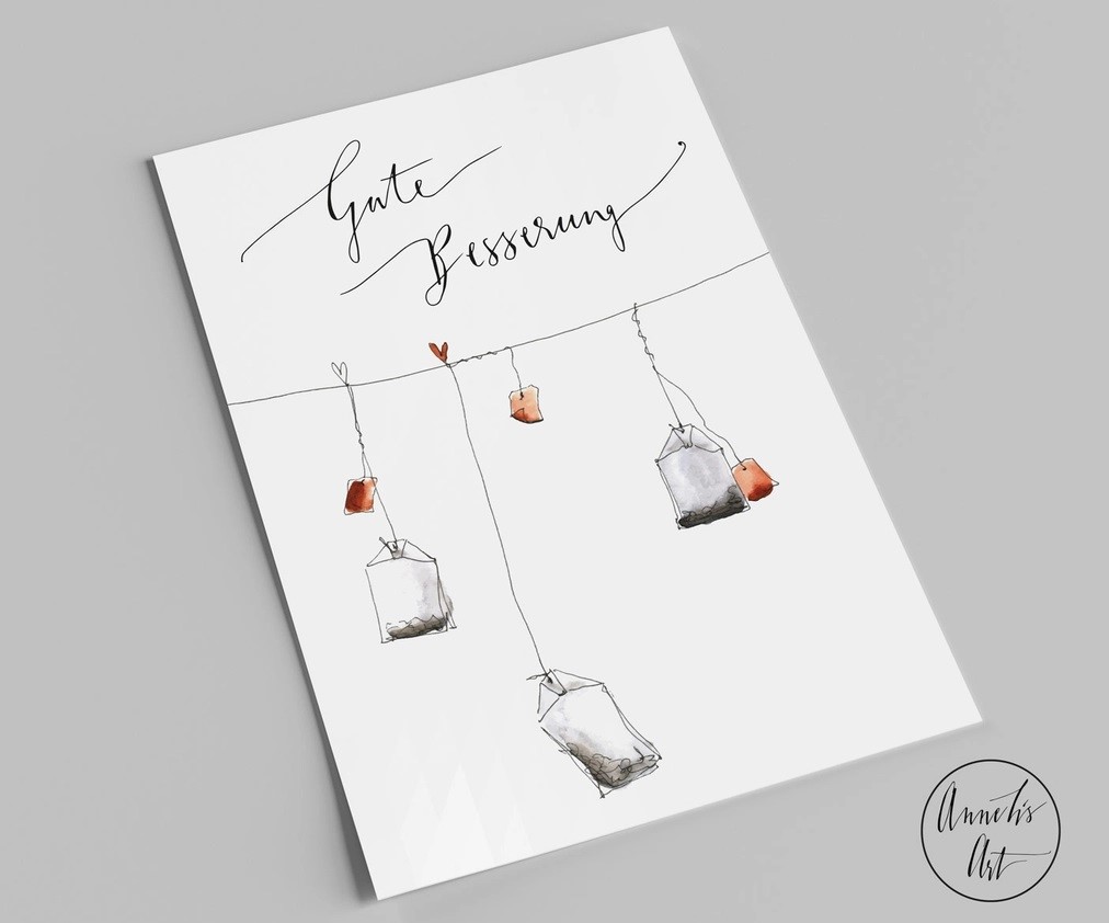 Schöne Postkarte zur guten Besserung, für Teefans und die, die es der Situation geschuldet gerade sein müssen. Auf der Rückseite ist Platz für deine individuelle Gestaltung, da kein vorgefertigtes Adressfeld wertvollen Platz wegnimmt. Abmessungen / Material: