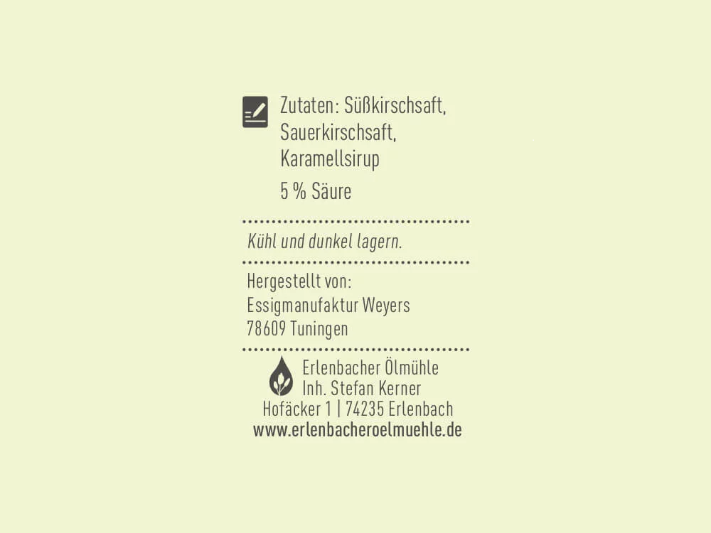 Zutaten: Süßkirschsaft, Sauerkirschsaft, Karamellsirup, 5 % Säure