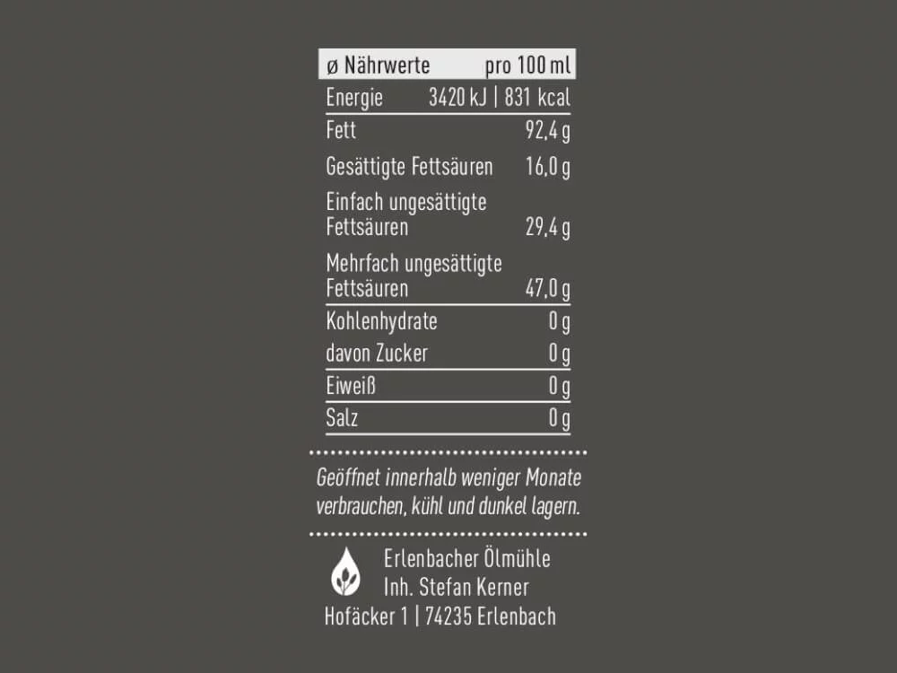 - Das kaltgepresste Öl sollte nicht über 130°C erhitzt werden.
