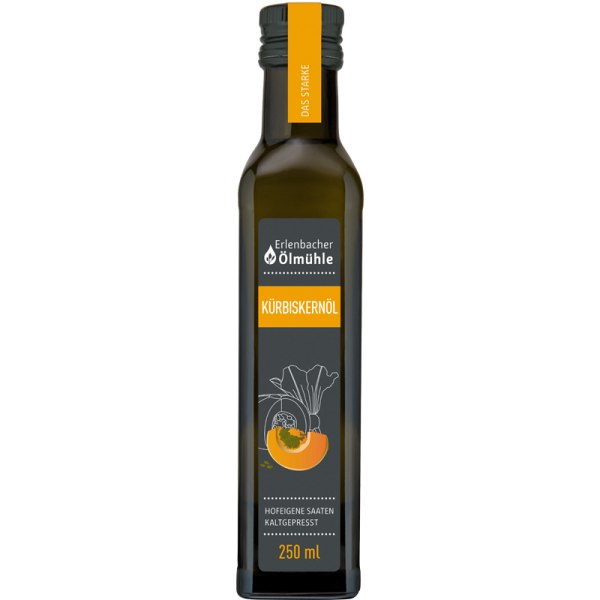 Die Besonderheit des Erlenbacher Kürbiskernöls liegt in der Verarbeitung der gewonnen Kürbiskerne. Diese werden ausschließlich naturbelassen und kaltgepresst.