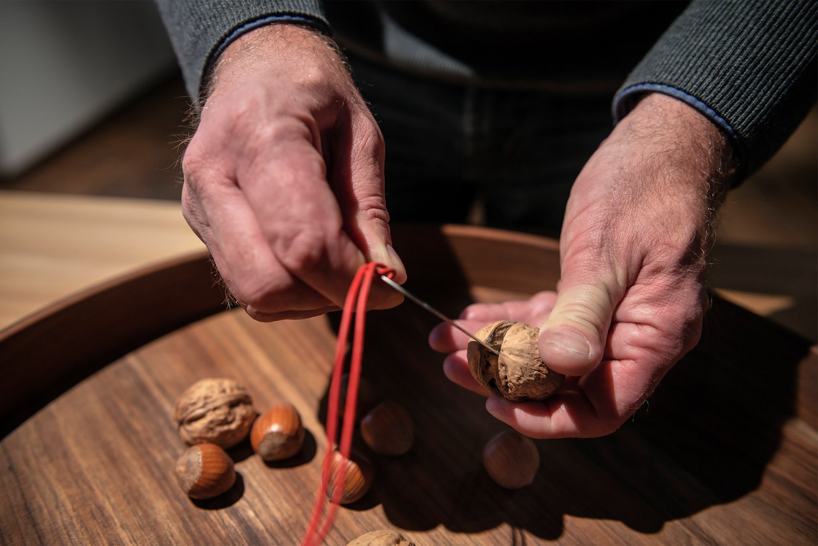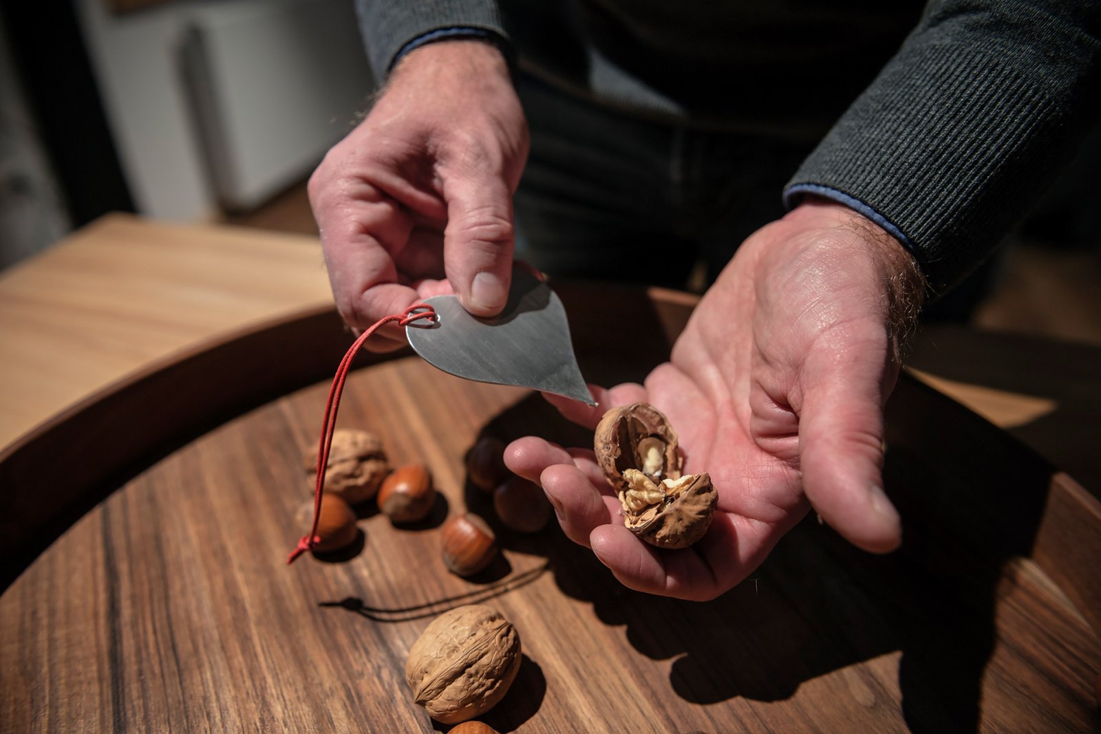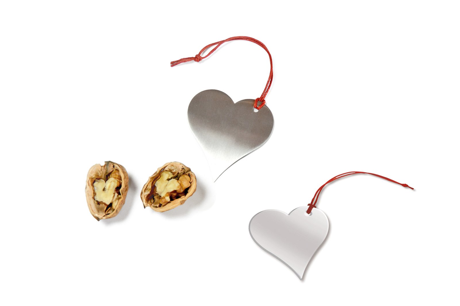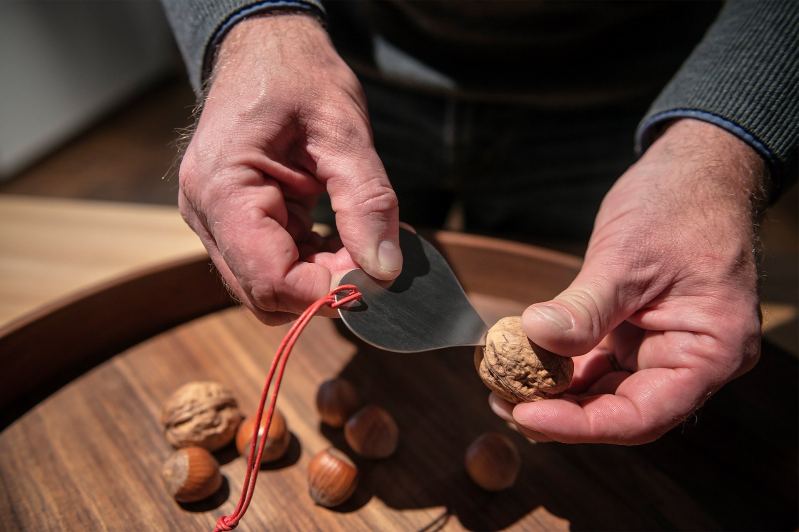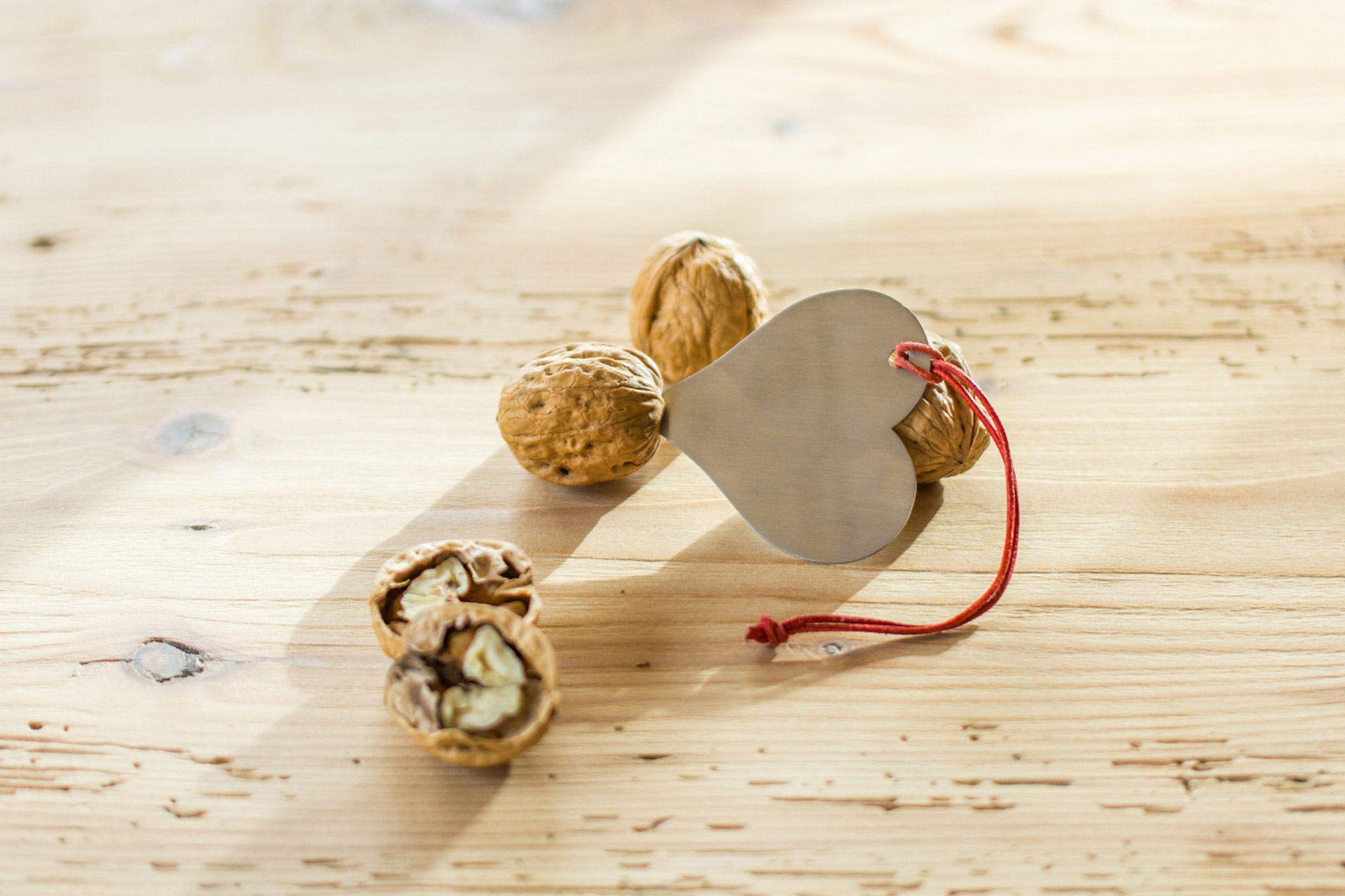 Ein Nussknacker aus Edelstahl am roten Lederbändchen verwirklicht diese Erkenntnis. Leicht und im Handumdrehen knackt der Nussknacker jede Walnuss.