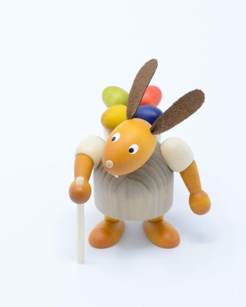 Um die große, mit bunten Eiern wohl gefüllte Kiepe über weite Strecken tragen zu können, haben ihm die Kunsthandwerker aus dem Hause Torsten Martin einen Wanderstock mit auf den Weg gegeben. So ist der brave Hase dann mühelos in der Lage die schwere Eierkiepe den langen Weg zum Ostereiersammelplatz stets mühelos tragen. Bestimmt wird er in Ihrem Zuhause sofort zum strahlend hellen Blickfang.