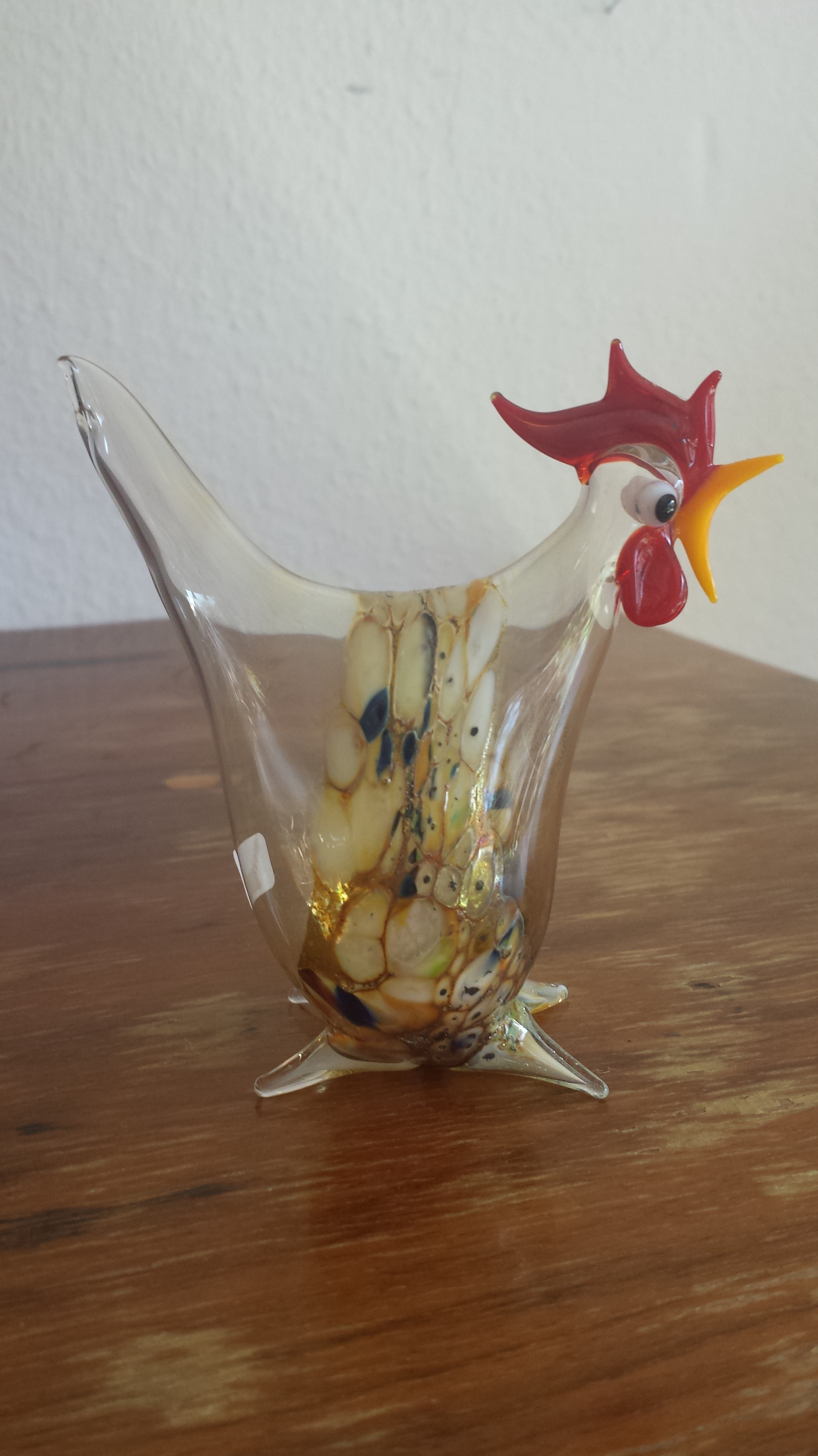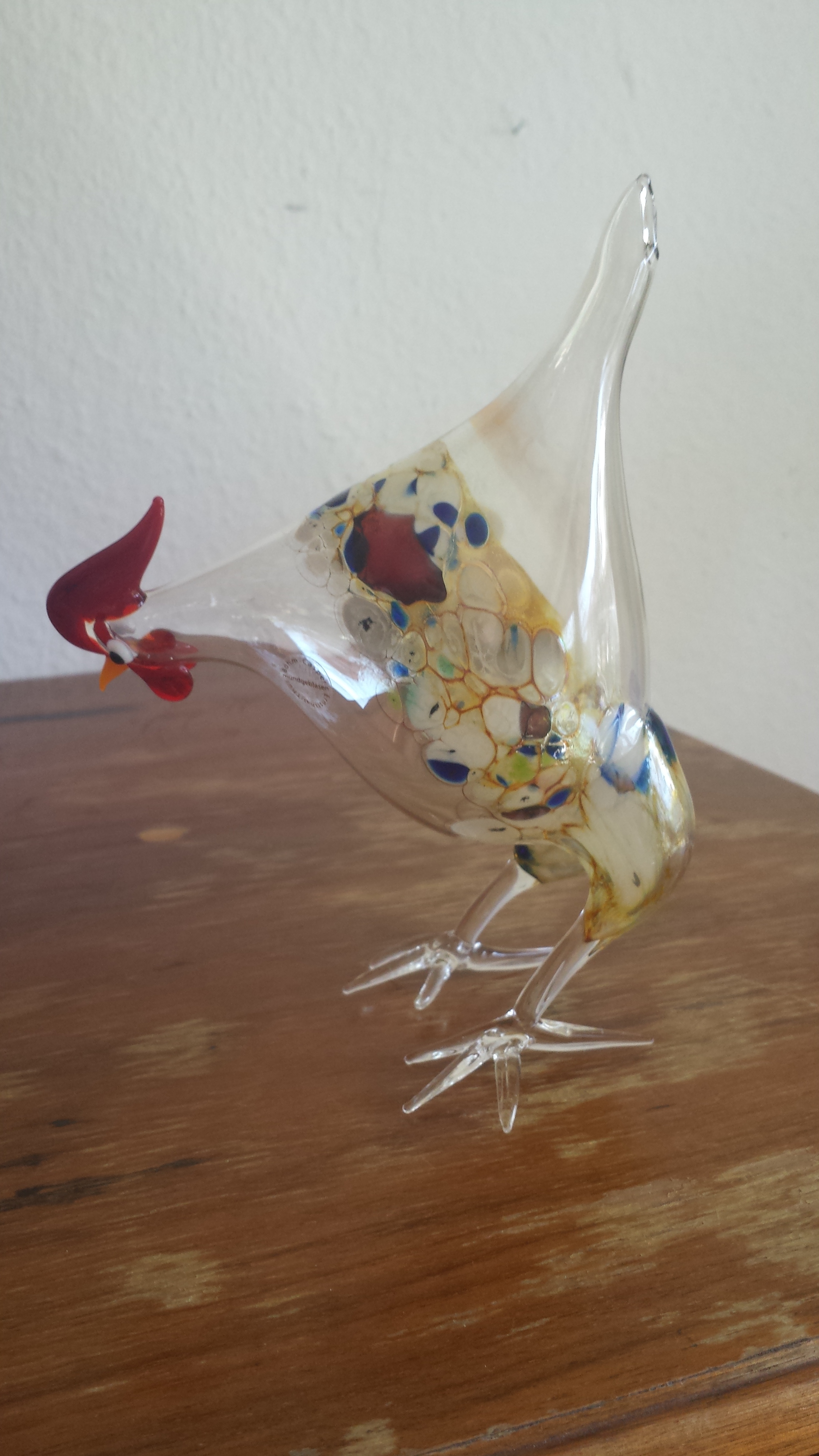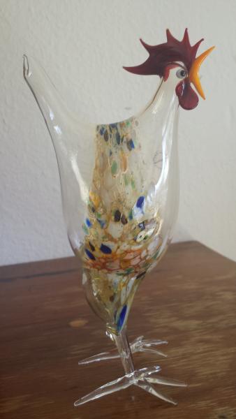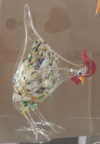 Ein mundgeblasenes Huhn oder Hahn aus Glas und Glasgranulat.