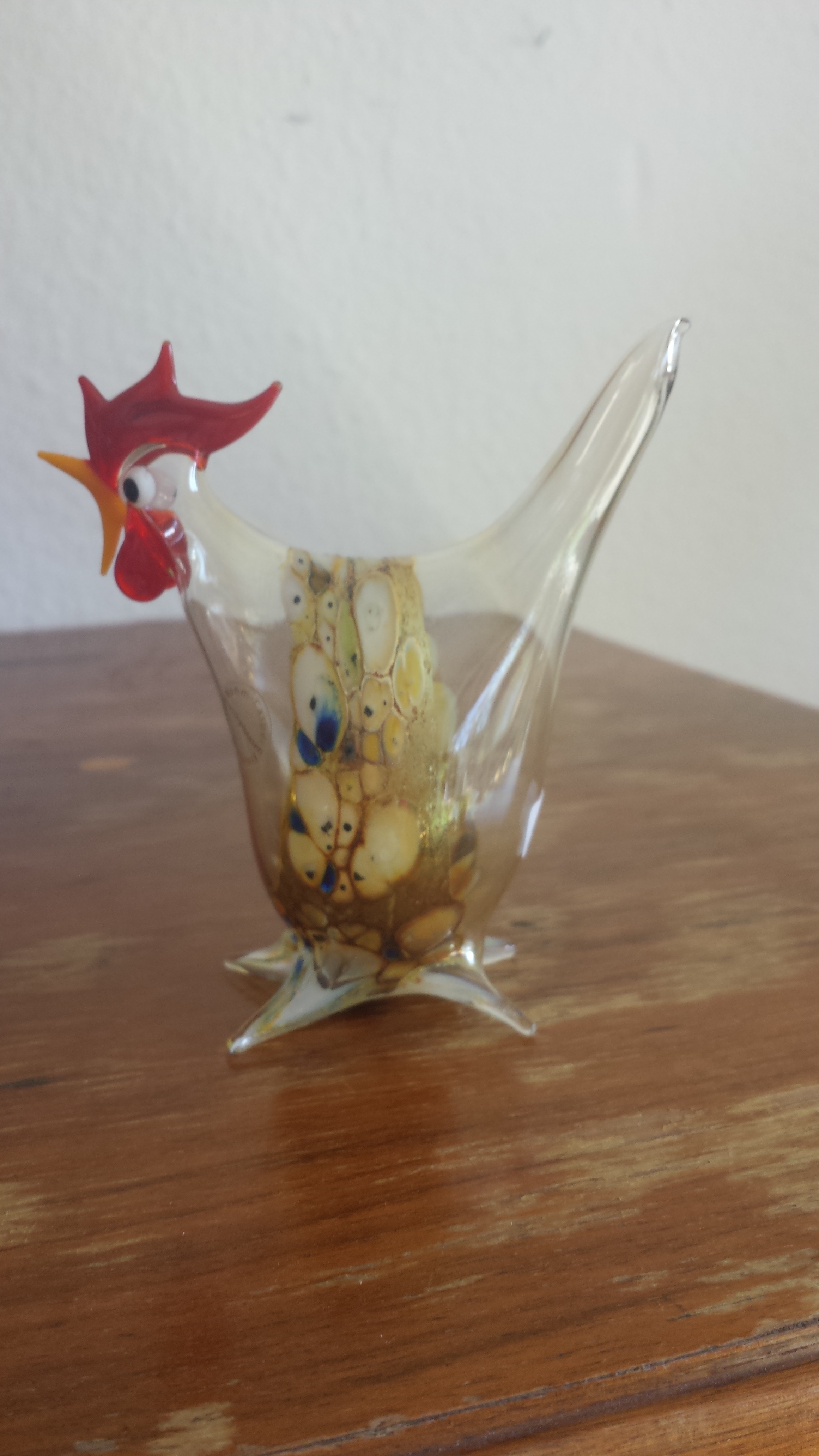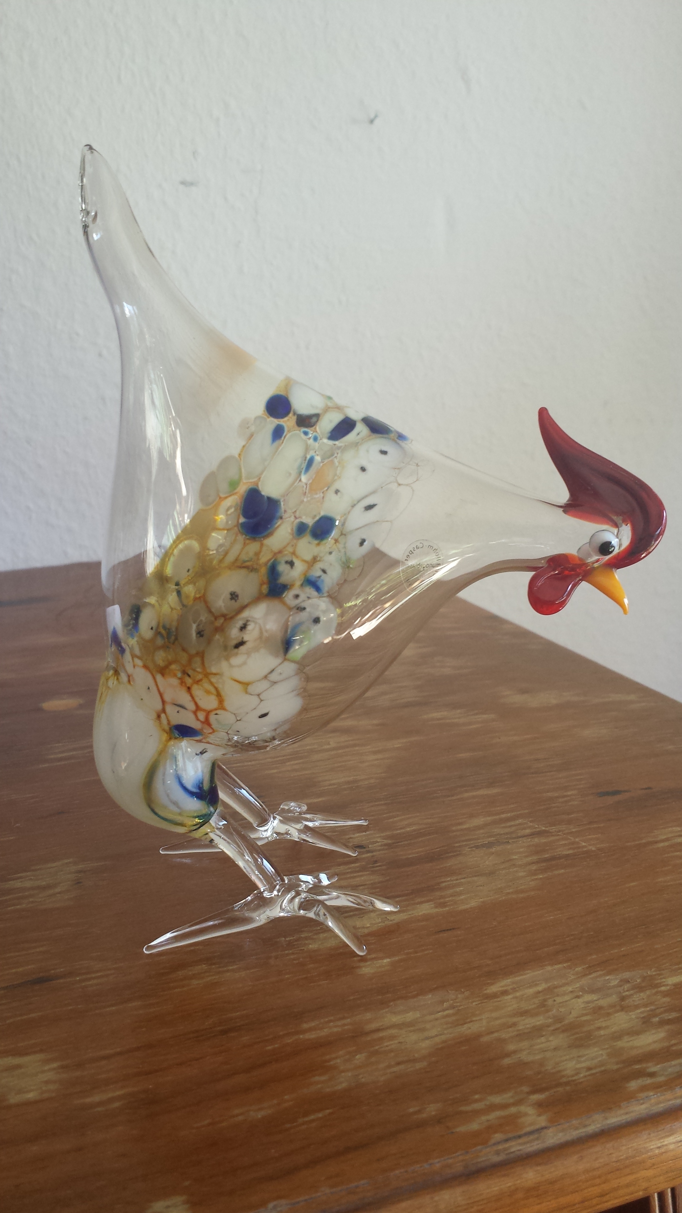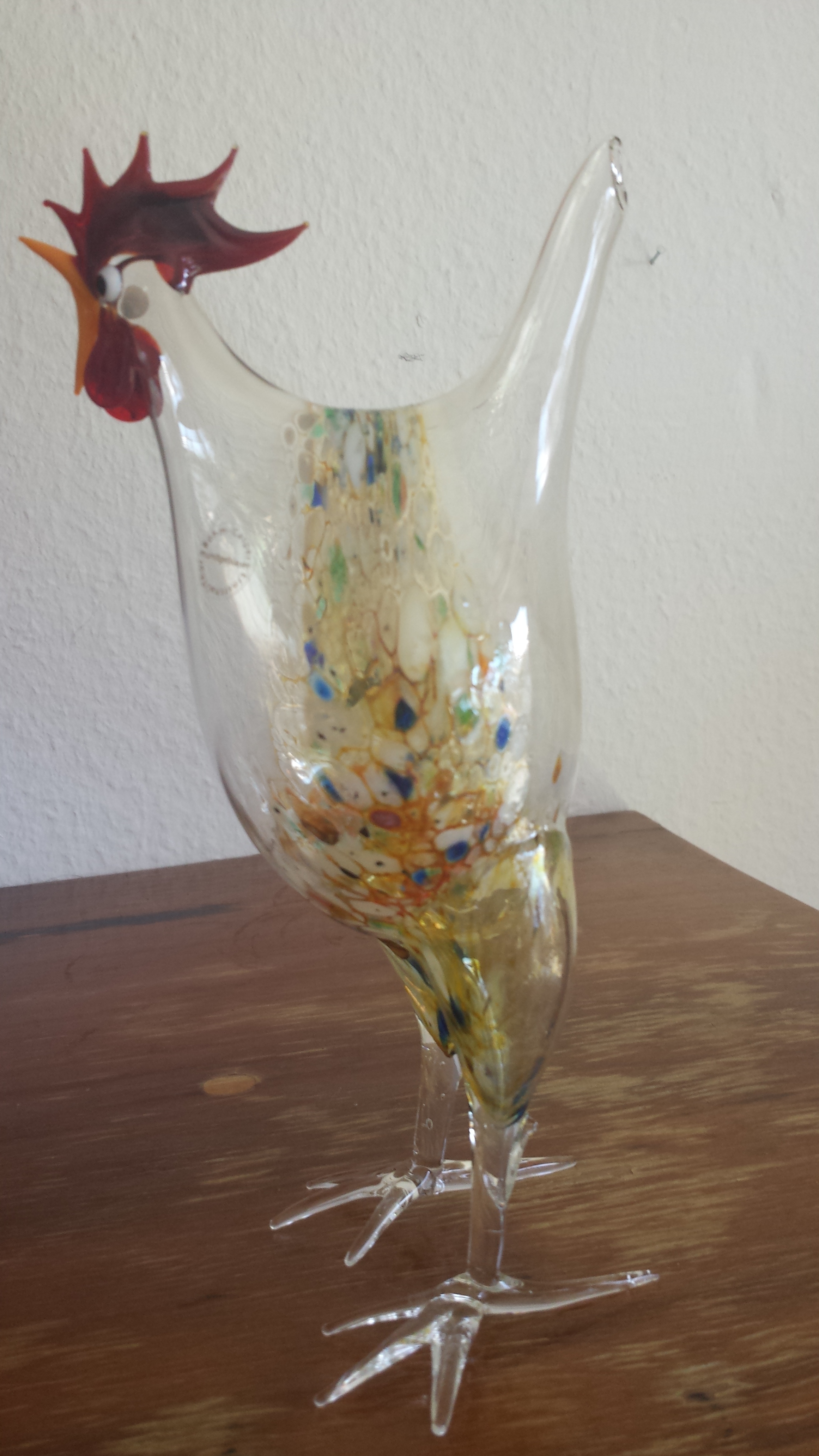 Ein mundgeblasenes Huhn oder Hahn aus Glas und Glasgranulat.